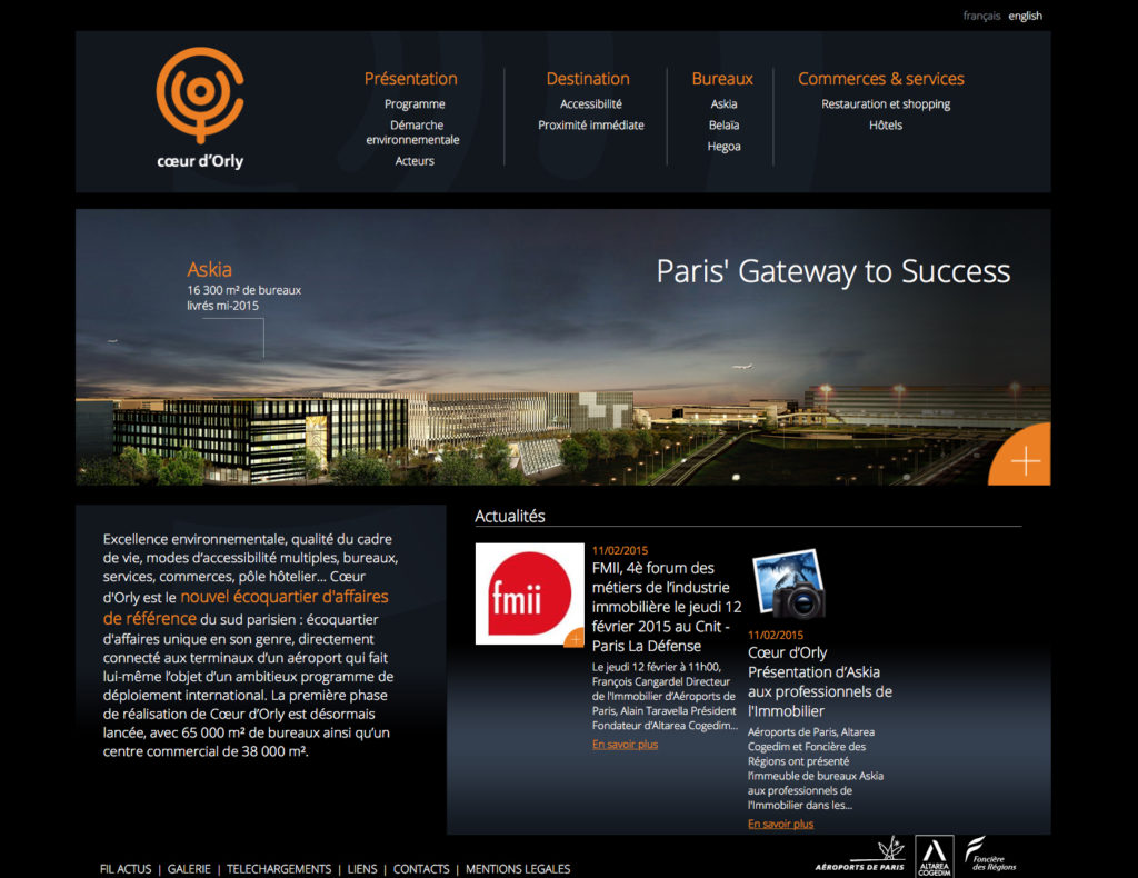 À la demande d’Ultra Fluide, j’ai réalisé le webdesign de ce site pour un projet immobilier d’envergure au sud du Grand Paris, à immédiate proximité de l’aéroport. Projet ensuite intégré par l’agence avec Typo3.