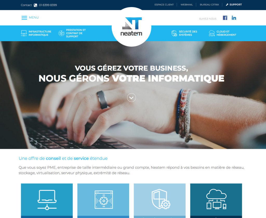 Neatem est une société de conseil et de services informatiques. Son site présente les prestations de l’netreprise, et donne accès aux différents services en ligne (webmail, connexion à distance). La création de ticket de support est directement intégrée au site.